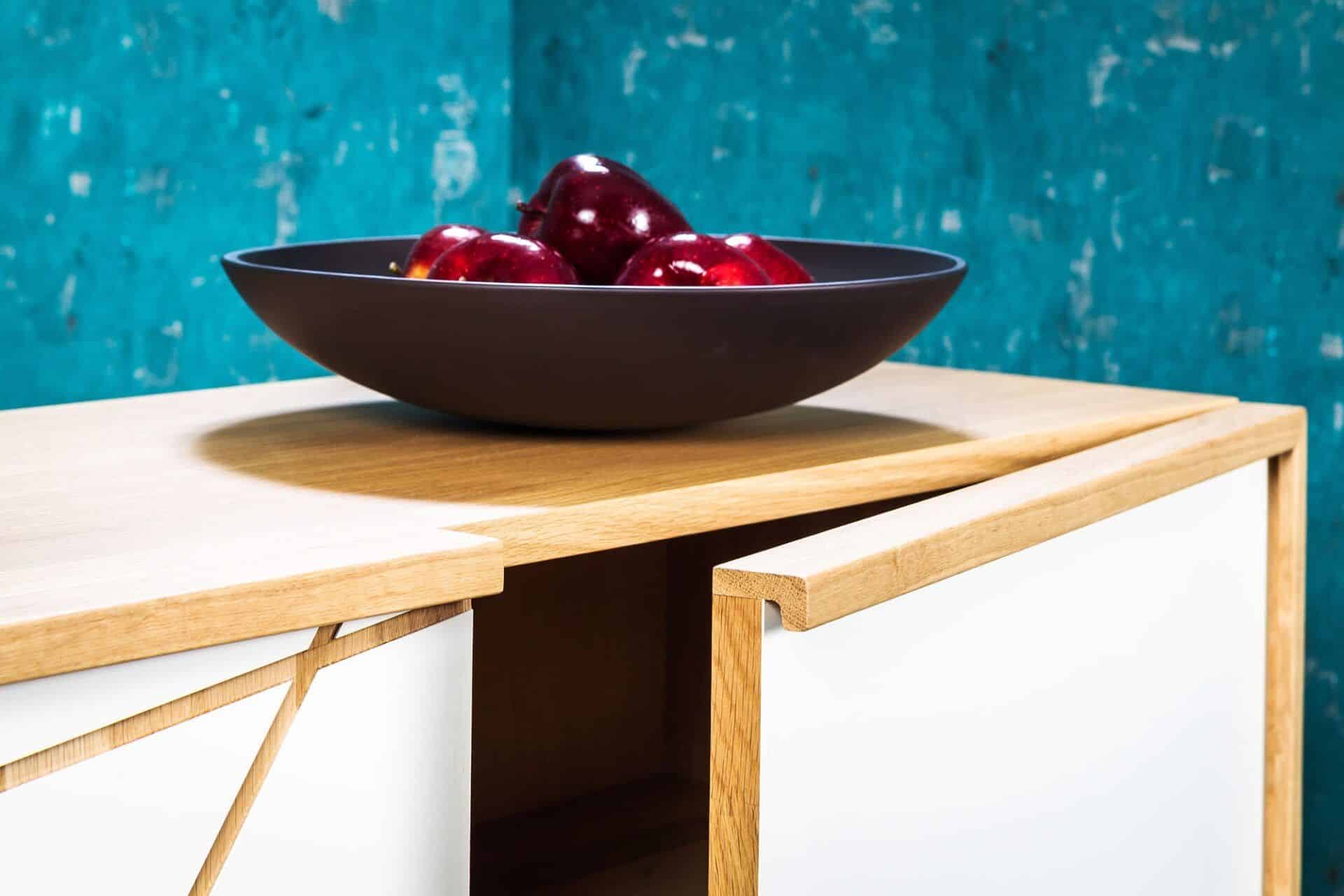 Komoda je vyrobena z masivního dubu, ořechu nebo dýhy. Úchytová lišta po obvodu dvířek podtrhuje charakter výrobku z masivního dřeva. Plocha dvířek je z hluboce matného laminátu, do kterého je vyfrézovaný nápaditý vzor. Vyrábíme také v rozměrech na míru a bez vyfrézovaného vzoru na dvířkách.