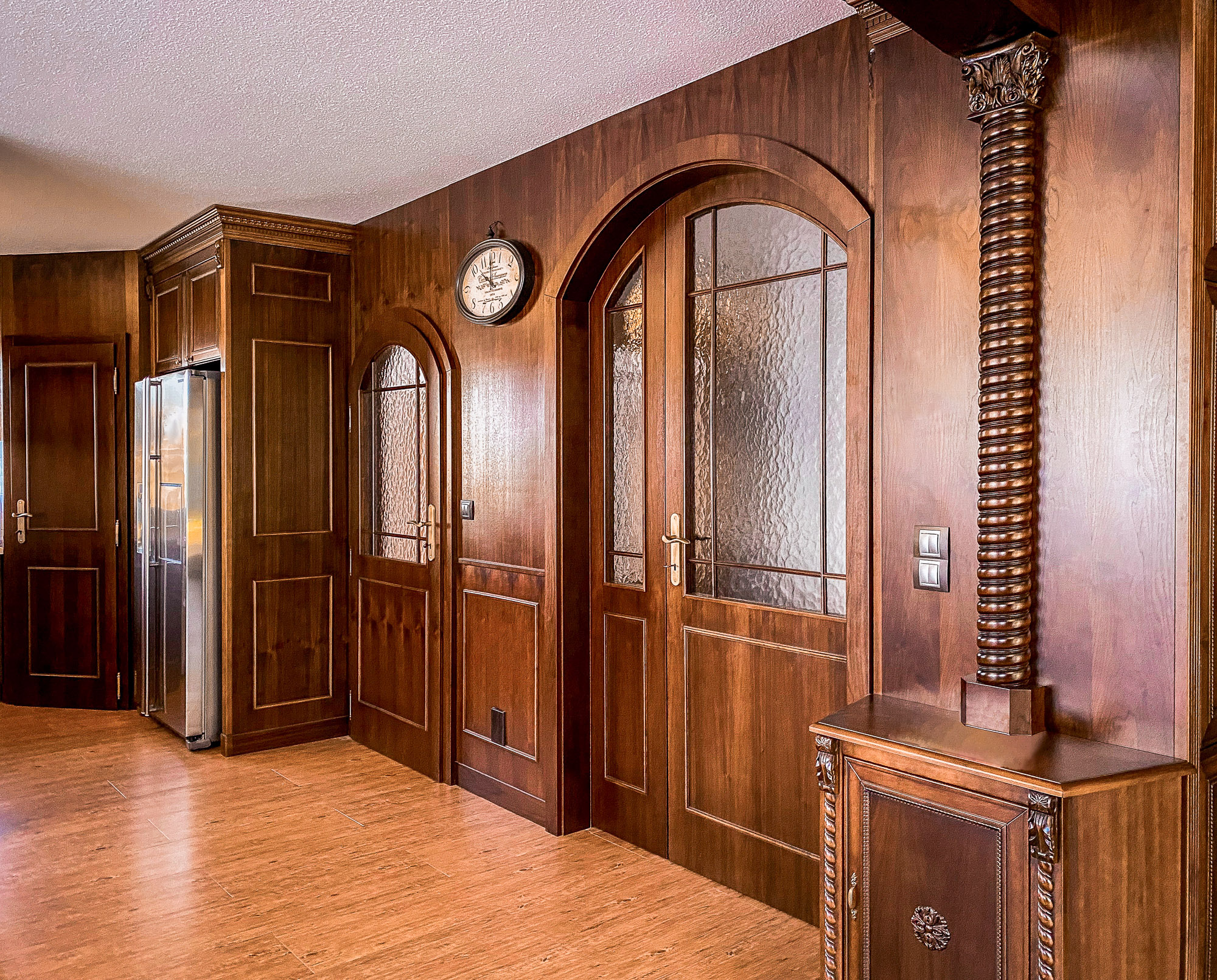 Stylový nábytek z ořechového dřeva se stal hlavním prvkem celého prostoru. Ruční řezby a detaily na nábytku přidaly eleganci a jedinečnost. Dřevěné obklady stěn a obložky dveří vytvořily atmosféru tepla a příjemného prostředí.